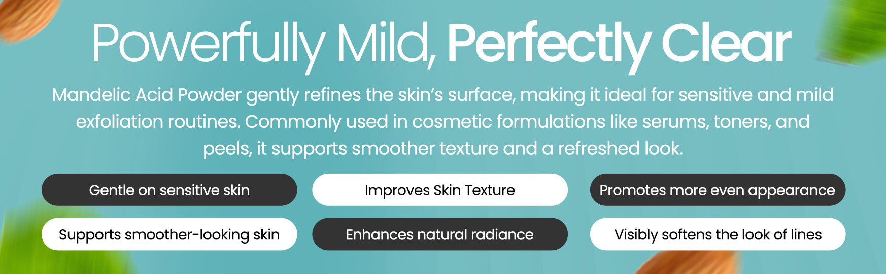 Mandelic Acid is a gentle alpha hydroxy acid (AHA) derived from bitter almonds, commonly used in skin peels, lotions, creams, serums, and wipes. Known for its mildness due to its larger molecule size, it is ideal for sensitive skin. Mandelic Acid effectively exfoliates, breaking down dead skin cells to promote a smooth, youthful complexion and even skin tone. It also brightens skin, reduces dark spots, and diminishes fine lines, making it a powerful anti-aging ingredient. Additionally, it helps unclog pores and reduce acne breakouts.